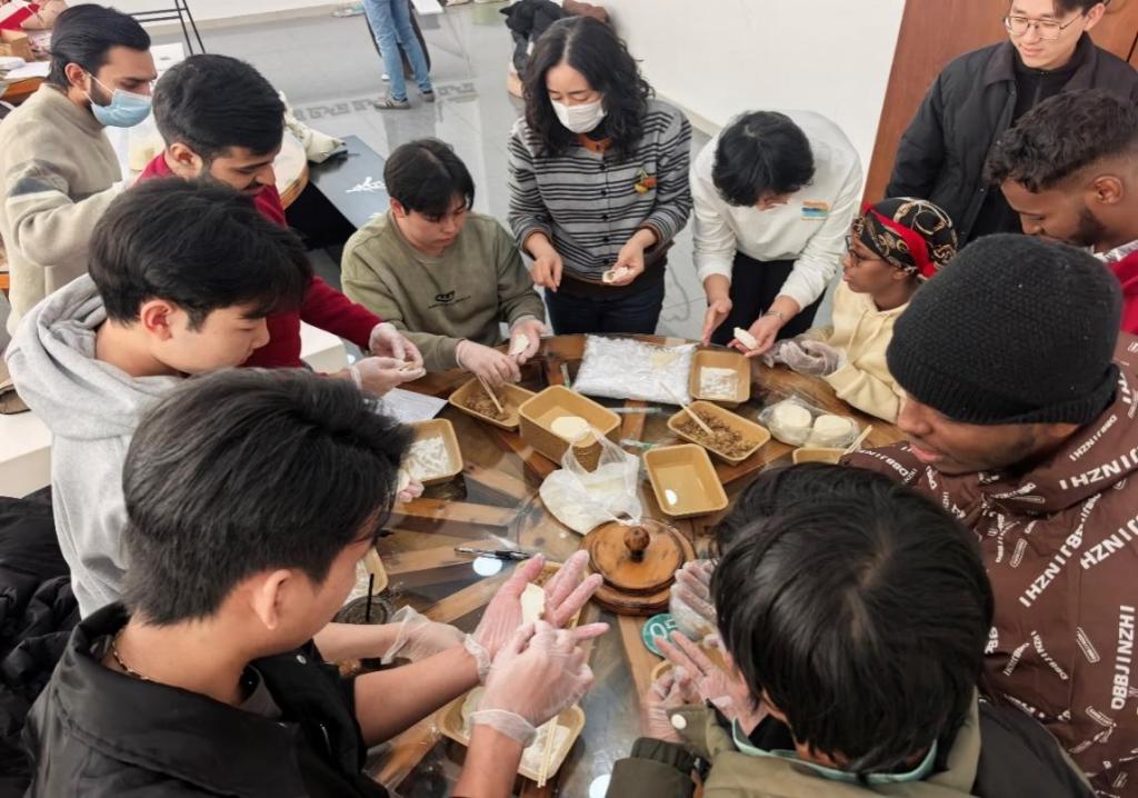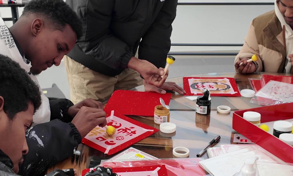 After the safety education session, the fun Spring Festival cultural experience officially kicked off. At the dumpling-making station, volunteers prepared flour, fillings and other ingredients and tools in advance, and taught international students hand-in-hand how to wrap dumplings. The international students followed along with great enthusiasm; although the dumplings they made came in various cute shapes, every student wore a look of dedication and delight.